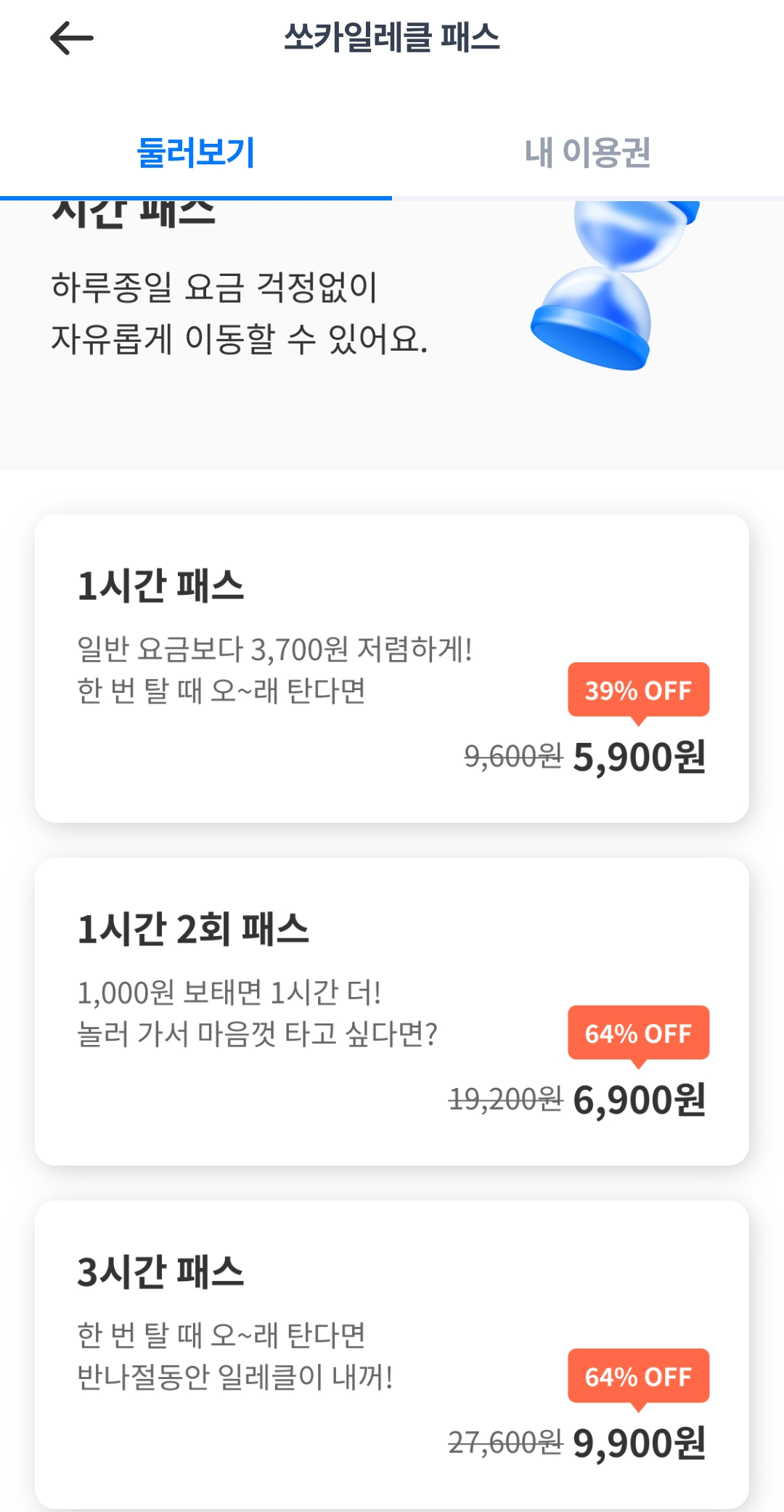 시간제로만 운영하며, 주간기준으로 잠금해제비용 500~600원, 분당 150~200원이다. 10분 타면 2000~2600원 정도?