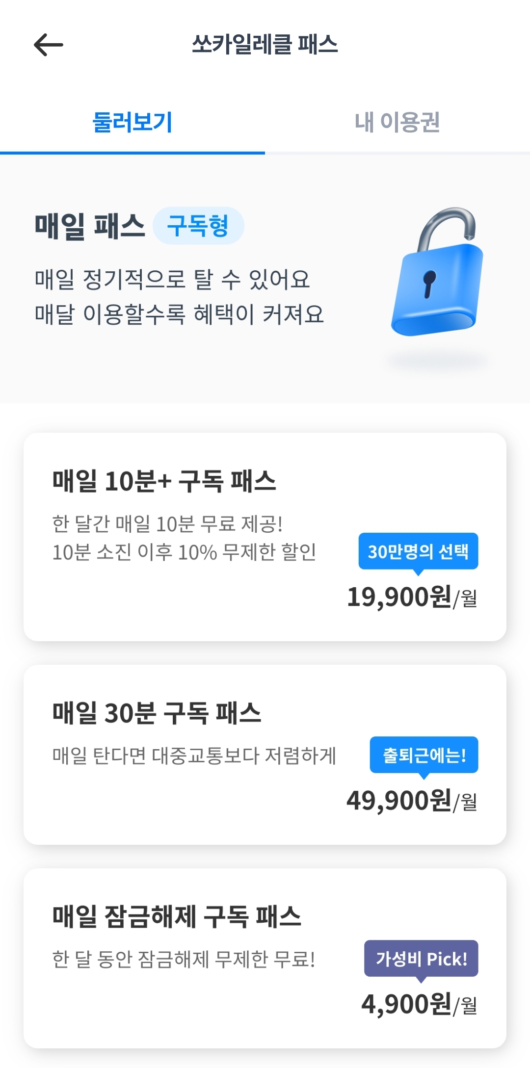 쏘카도 패스가 있는데, 매일패스 가격대를 보면 매일 10분이면 1500~2000원씩 나가는 건데, 이를 10번 탄 가격과 맡먹는 셈이다. 잠금해제도 한 번에 500원인 거 생각하면 정말 자주, 적어도 달에 11번 이상은 타야겠다 생각함