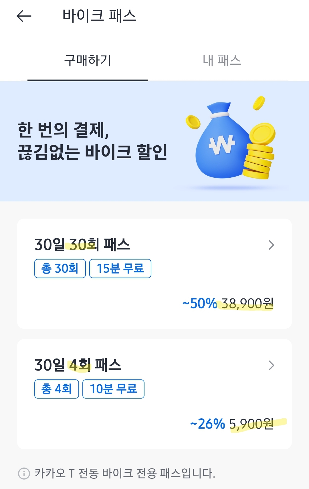 월에 카카오 자전거를 4번 이상 타는 사람이라면 패스를 사 놔도 괜찮지 않을까 싶다. 물론 나는 평소 대중교통을 타면서 K-패스 지원을 받고 있어서 어느 정도 비교를 해봐야 할 것 같다..